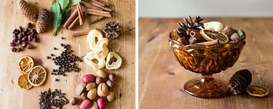 Des rondelles d’agrumes séchées, des bâtons de cannelle, des pommes de pin, des amandes, des clous de girofle, de l’anis étoilé..