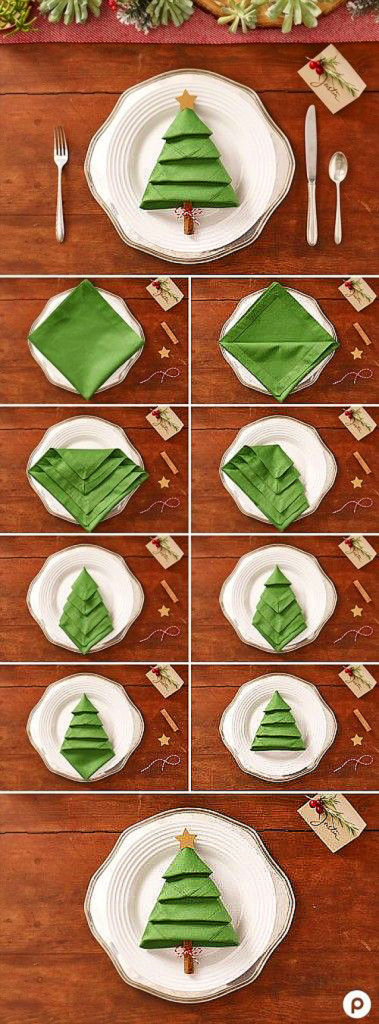 Personnalisez les places de vos invités avec un pliage de serviette en forme de sapin facile à réaliser